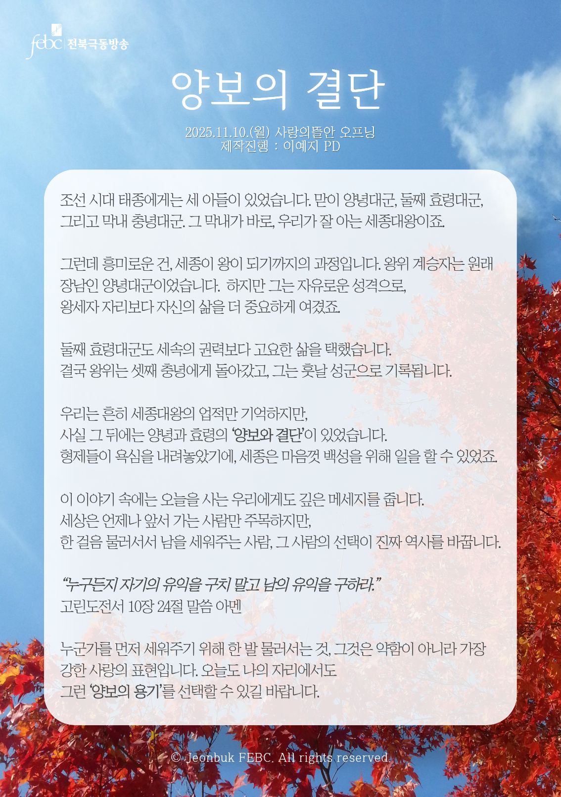 [전북] 25.11.10.(월) 사랑의뜰안 오프닝 "양보의 결단"