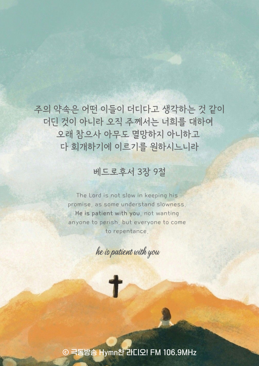 주의 약속은 어떤 이들이 더디다고 생각하는 것 같이 더딘 것이 아니라 오직 주께서는 너희를 대하여 오래 참으사 아무도 멸망하지 아니하고 다 회개하기에 이르기를 원하시느니라
