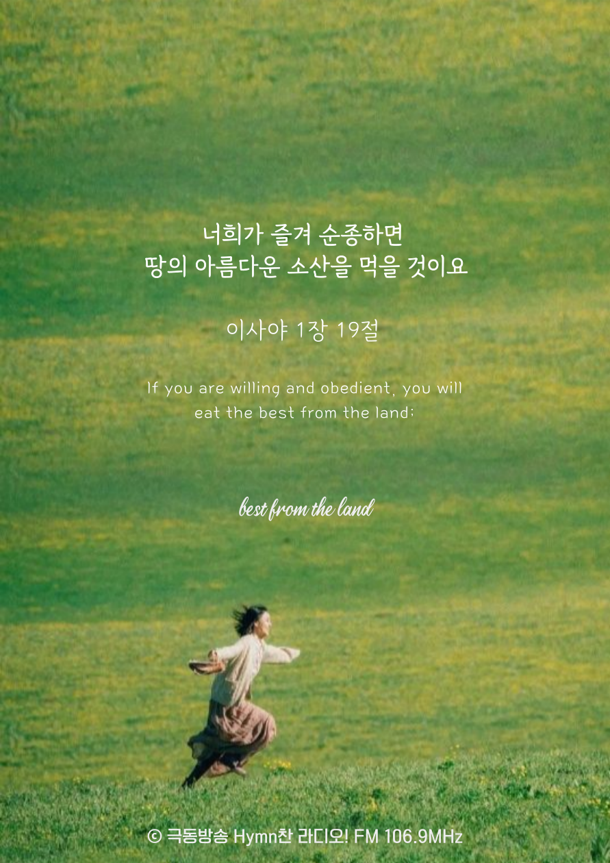 너희가 즐겨 순종하면 땅의 아름다운 소산을 먹을 것이요