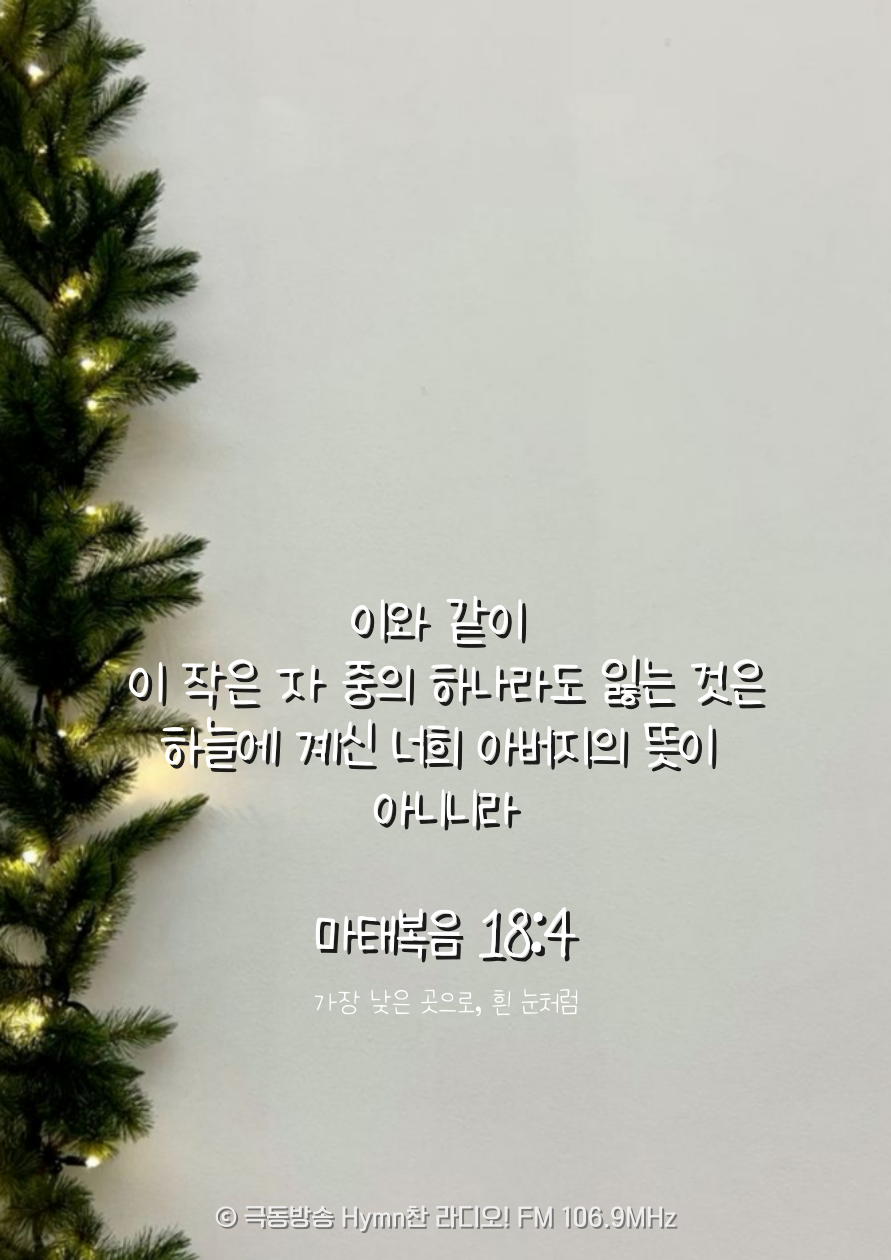 성탄의 계절, 가장 높은 곳에서 가장 낮은 곳으로 오신 예수님처럼, 우리도 가장 낮은 곳을 찾아가 섬기는 것을 부끄러워하지 않고 오히려 자랑스럽게 여기는 그리스도인들이 되기를 소망합니다.