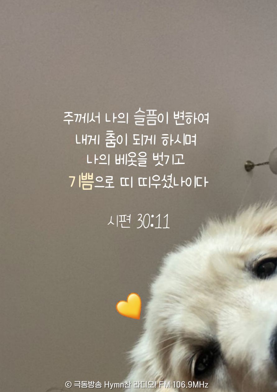 주께서 나의 슬픔이 변하여 내게 춤이 되게 하시며 나의 베옷을 벗기고 기쁨으로 띠 띠우셨나이다
