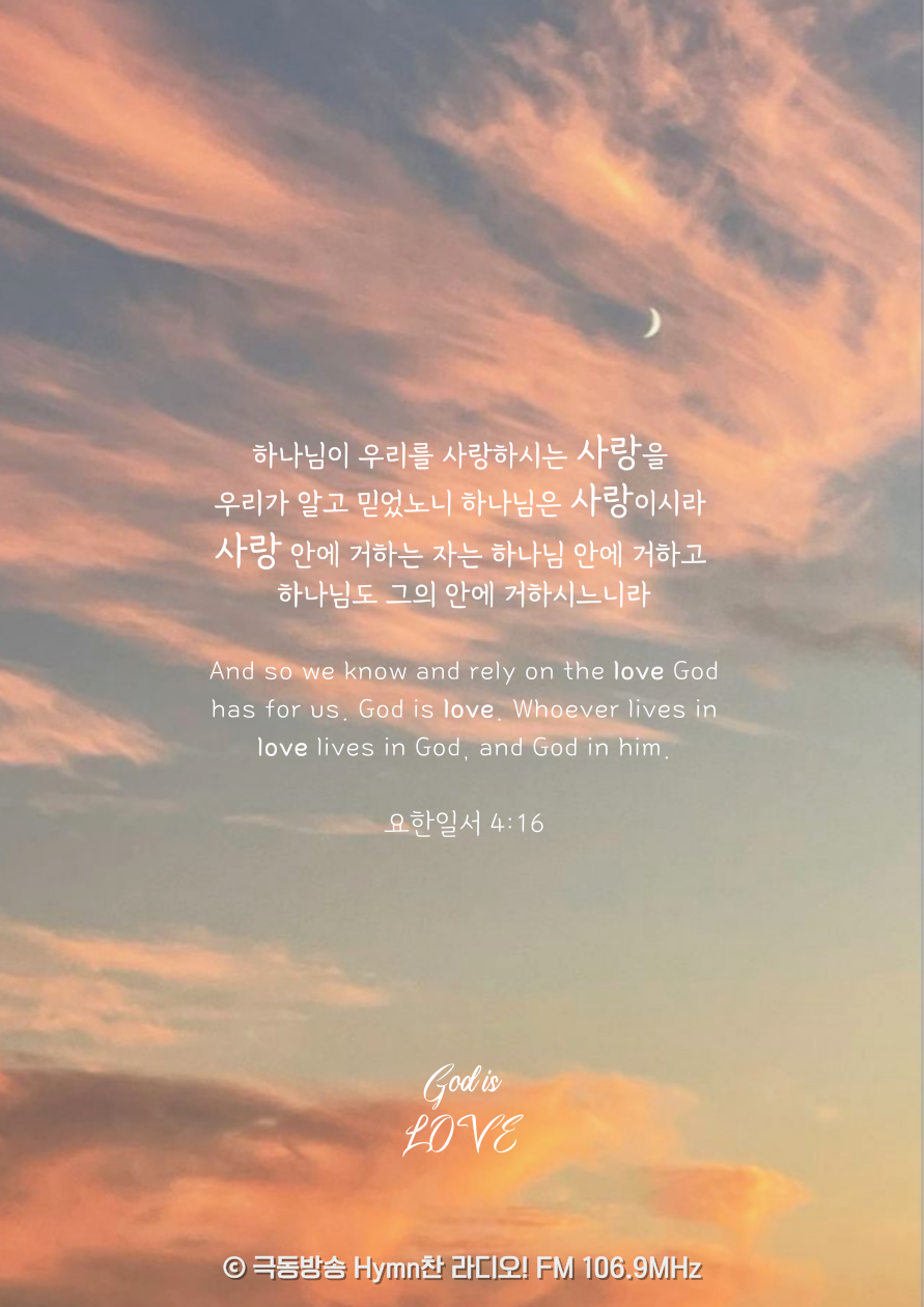 하나님이 우리를 사랑하시는 사랑을 우리가 알고 믿었노니 하나님은 사랑이시라 사랑 안에 거하는 자는 하나님 안에 거하고 하나님도 그의 안에 거하시느니라